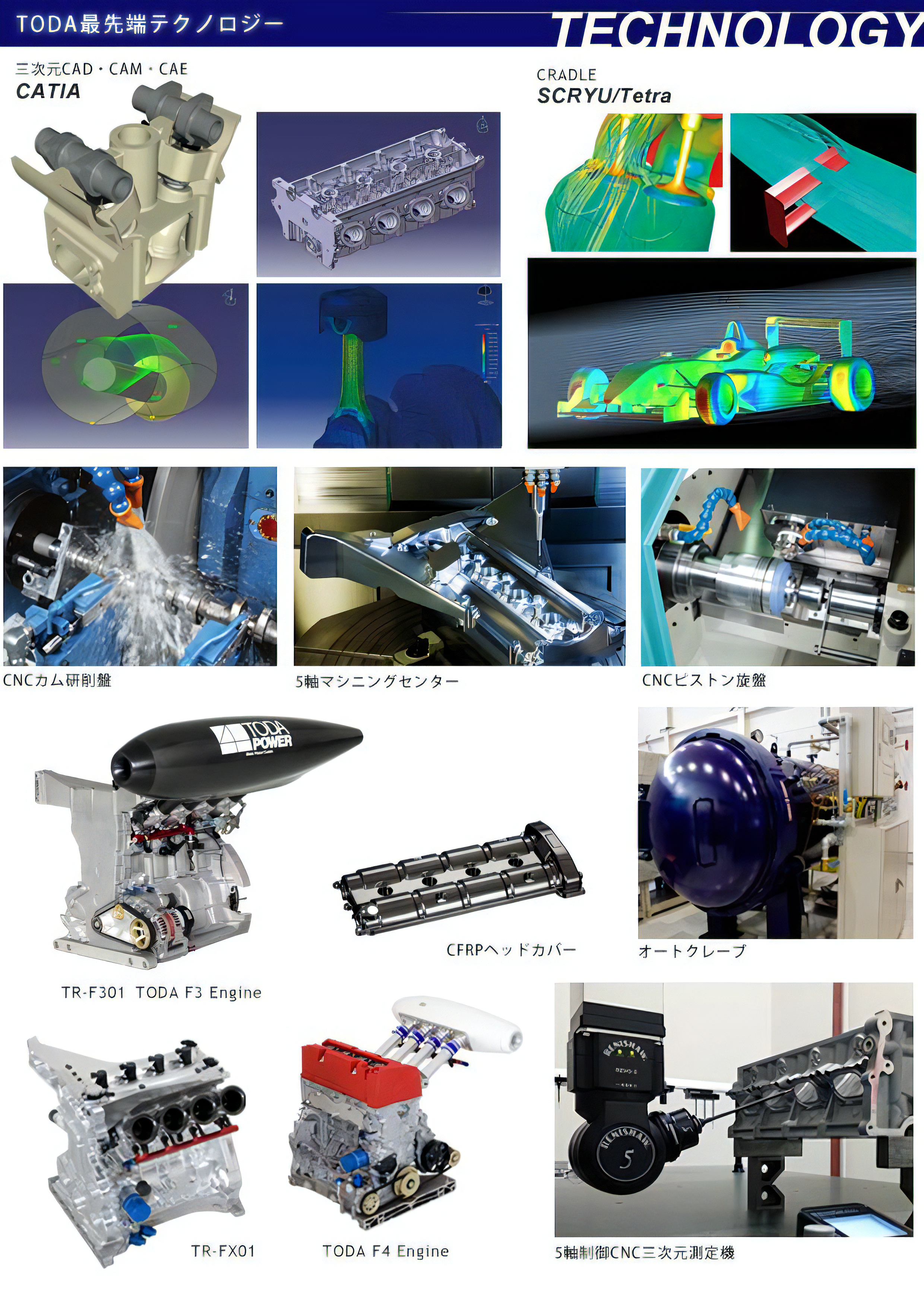 究極の技術力と開発スピードが求められるフォーミュラレースの世界。 (株)戸田レーシングは、レーシングフィールドで鍛えられた圧倒的な開発力を、商品の開発と製造に惜しみなくフィードバックしています。また CAD/CAE/CAMなど、最先端の開発・製造システムを世界に先駆けて投入するとともに、ソフトウェア会社と共同で、新しい 解析システムの開発にも 携わっています。